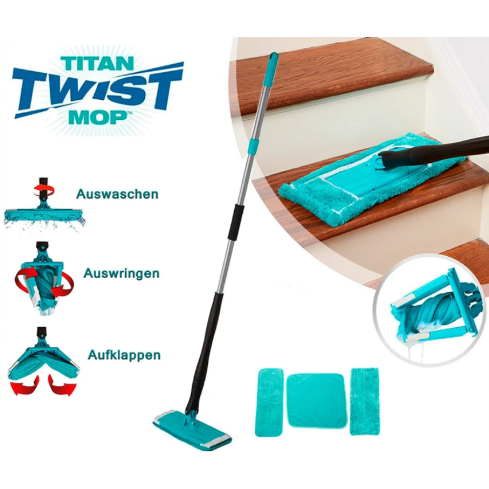 Швабра Titan Twist Mop является революционной в сфере влажной уборки в помещении. Удобная длинная поворотная ручка, телескопического типа, удобна и поможет достать до любого загрязнения. Шарнирная "голова" швабры может вращаться на все 360 градусов для возможности проведения уборки в местах где обычная швабра просто неспособна протиснутся.