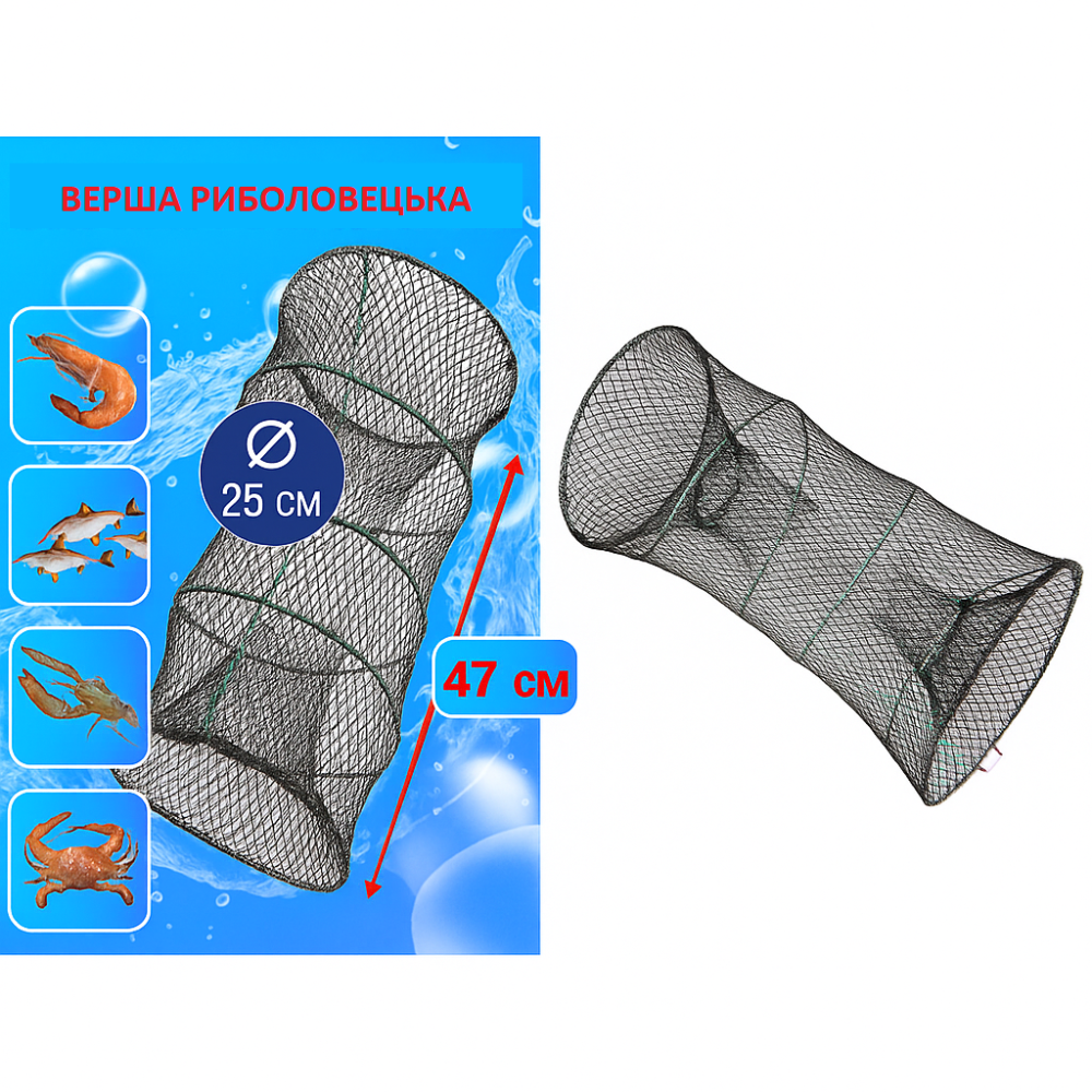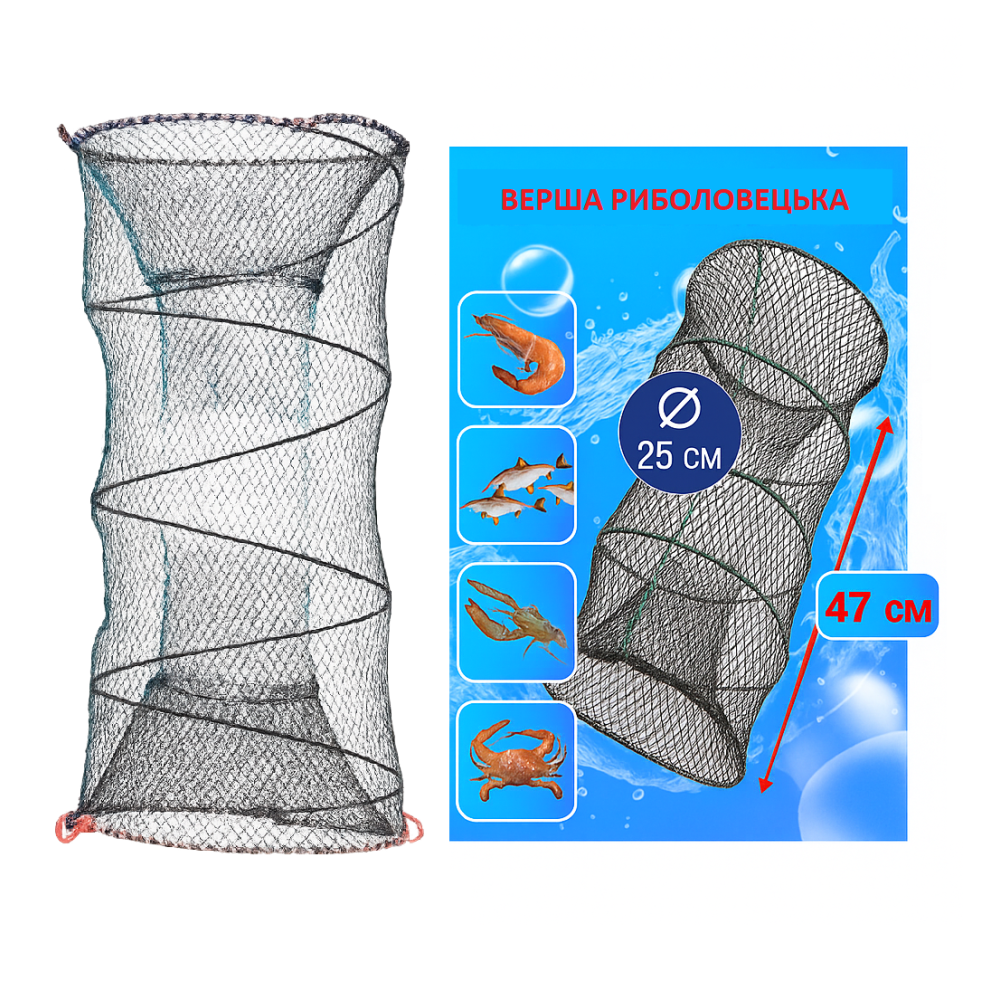 Верша изготовлена из прочного нейлонового волокна с мелкой сеткой, что позволяет удерживать как мелкую рыбу, так и более крупную добычу — раков, креветок, крабов. Каркас усилен металлическими кольцами, которые сохраняют форму даже при сильном натяжении. Ловушка быстро складывается, занимает минимум места в рюкзаке и легко транспортируется