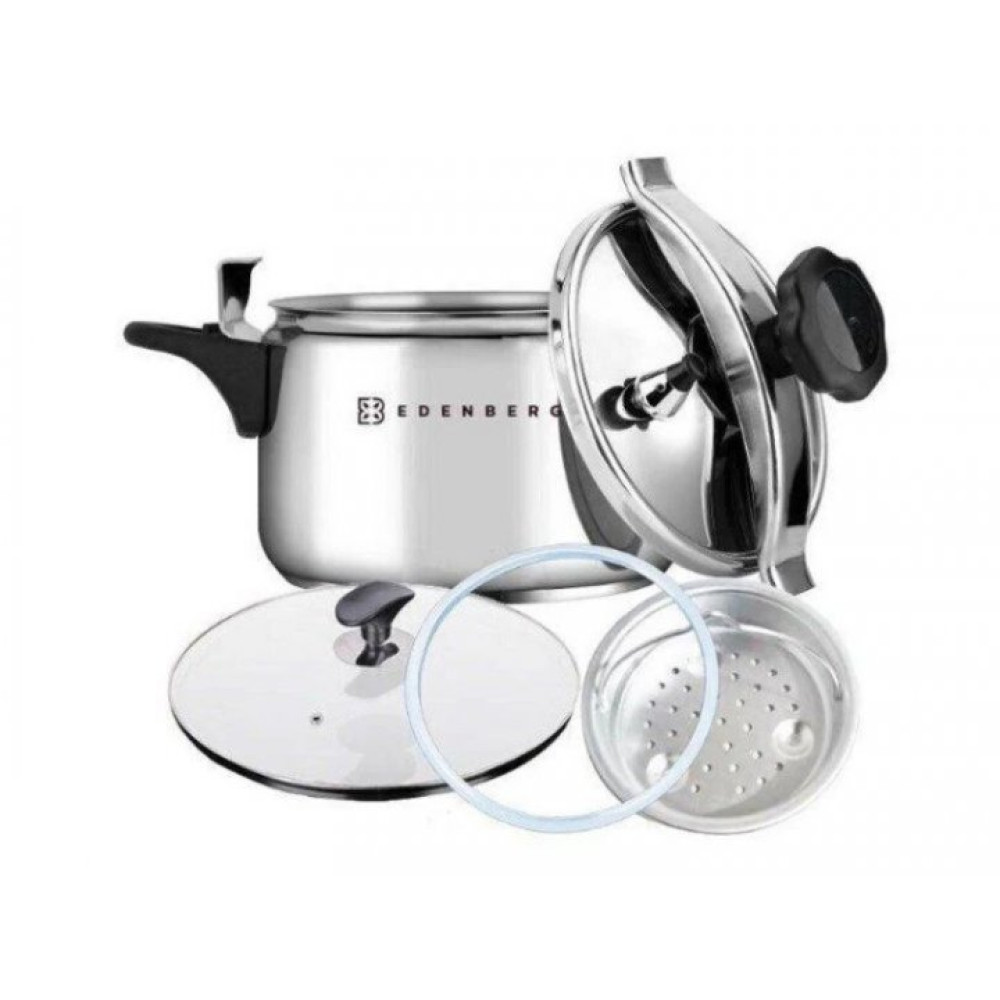 Скороварка – пароварка Edenberg EB-3770 Нержавеющая сталь 9 л намного сокращает время приготовления пищи, кроме того, продукты в ней практически не пригорают и сохраняют содержащиеся в них витамины. Еда готовится быстро за счет плотного прилегания крышки к корпусу скороварки. Крышка прижимается за счет винтов, что создает высокое давление и температуру внутри емкости. Пар выходит только через клапан, в следствии этого время приготовления уменьшается в разы.