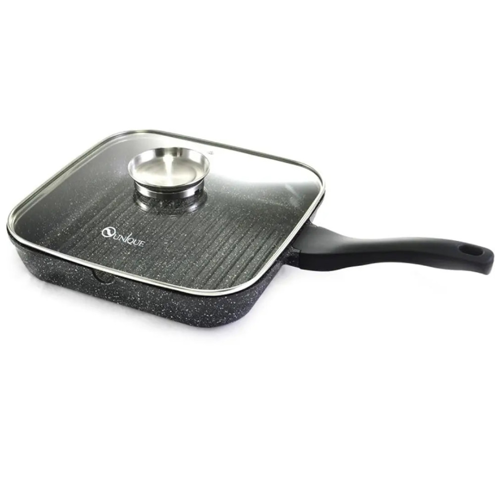 Сковорода-гриль UNIQUE UN-4012 изготовлена из прочного алюминиевого сплава, что обеспечивает длительный срок службы и надёжность в использовании. Антипригарное гранитное покрытие позволяет готовить пищу без пригорания и с минимальным количеством масла. Ребристая поверхность гриля создаёт характерные полосы на продуктах и уменьшает расход жиров во время жарки