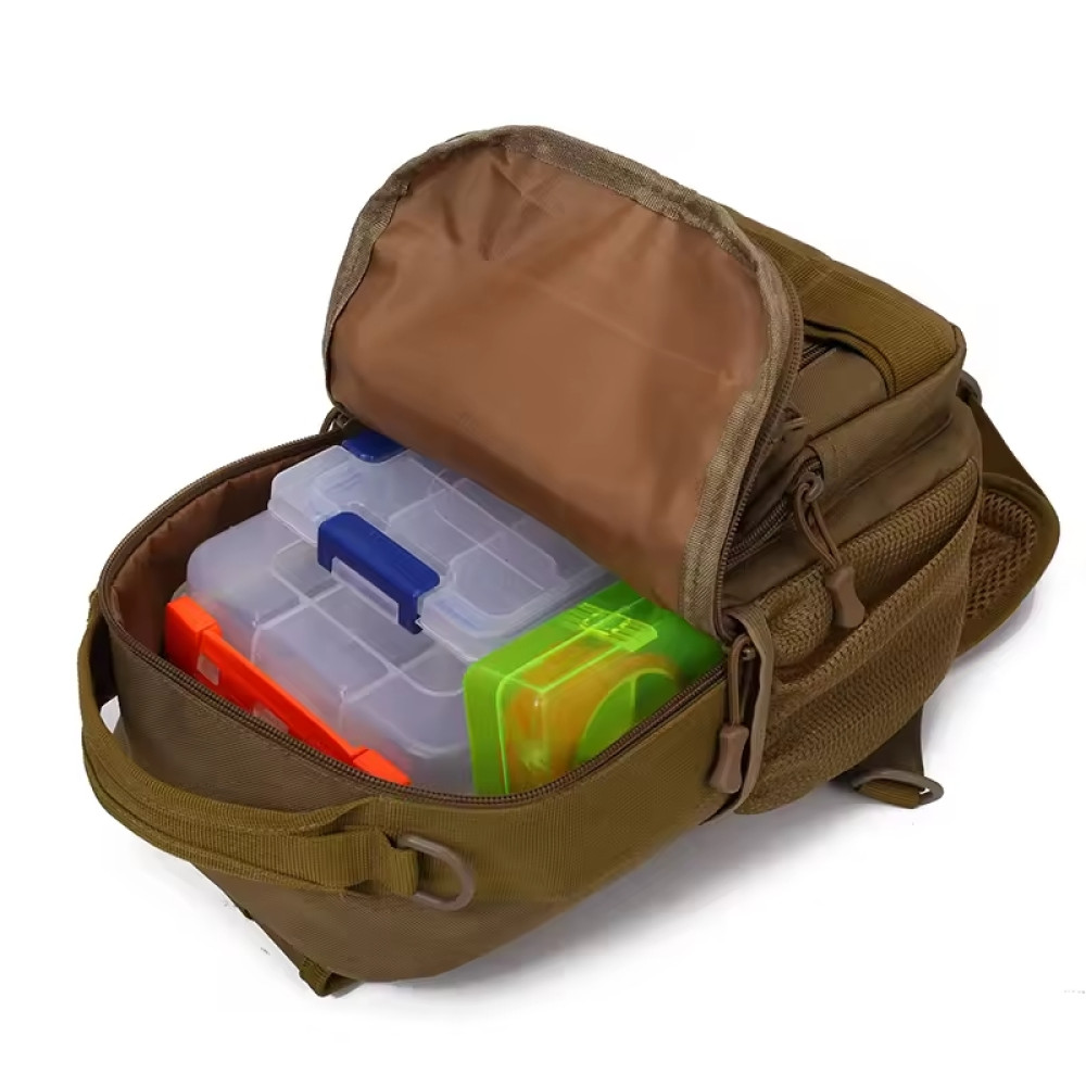 Удобная и функциональная сумка через плечо создана специально для рыболовов, которые ценят порядок, доступность снаряжения и комфорт в полевых условиях. Подходит как для рыбалки, так и для туризма, охоты или повседневного использования. Основное отделение и продуманная система карманов позволяют организовать всё необходимое — от блёсен до поводков и катушек.