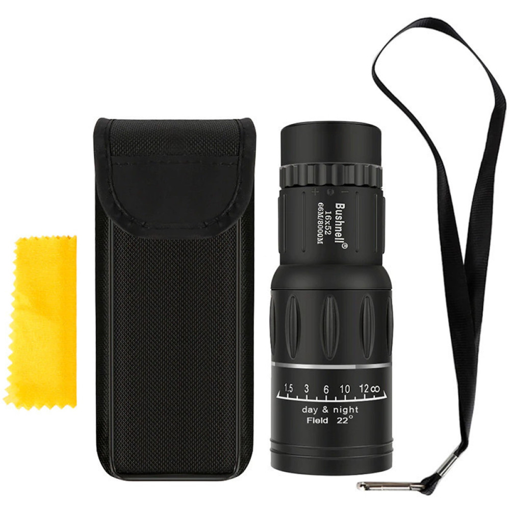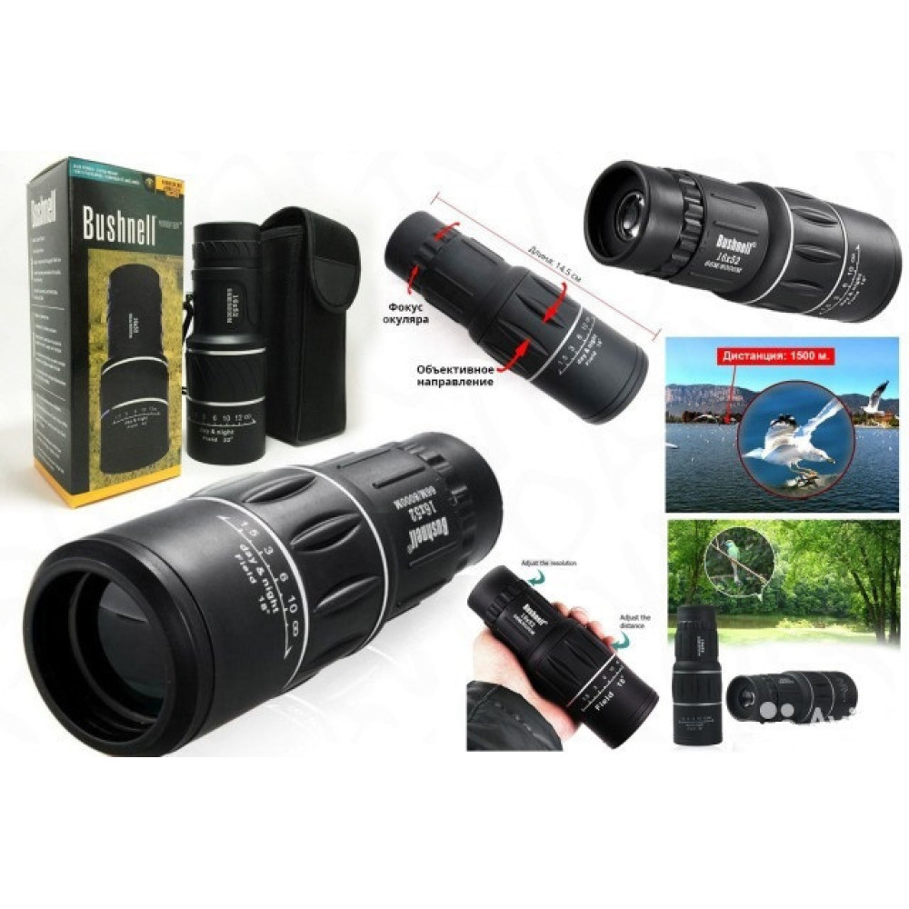Bushnell 16X52 идеально подходит для наблюдений на природе, на рыбалке или охоте. Монокуляр защищен от возможных ударов и капризов погоды. Прост и очень удобен в обращении. Яркое и красивое изображение с монокуляра получается при помощи линз превосходного качества. Монокуляр с защищенными от запотевания линзами идеален в экстремальных условиях. Асферический элемент в окуляре устраняет искажения изображения. Конструкция с вынесенной точкой визирования обеспечивает хорошую видимость всего поля зрения, даже тех, кто носит очки. Поворотно-выдвижные наглазники облегчают подбор правильного расположения монокуляра относительно глаз. Широкое поле зрения. Многослойное просветляющее покрытие линз и большой диаметр объектива для оптимальной четкости изображения. Резиновое покрытие для защиты от ударов и надежного удобного захвата. Оптика из стекла Eco-glass, не содержащая свинца и мышьяка. Надежный ремень.