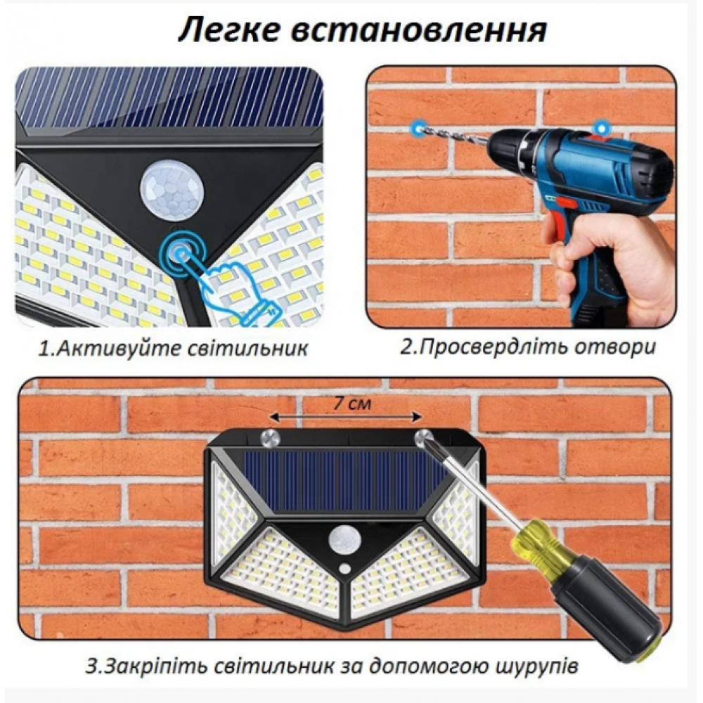 Комплектация: 1 x 100-светодиодный солнечный фонарь с датчиком движения 1 x инструкция пользователя 1 х комплект крепления