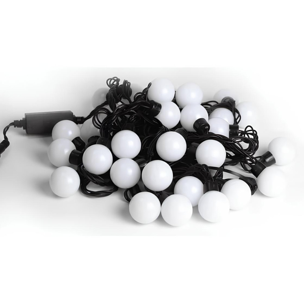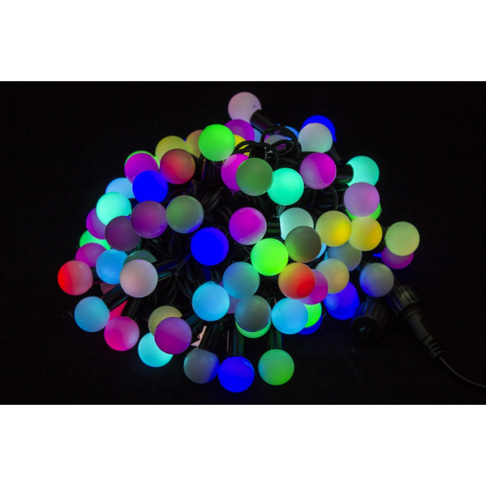 Гирлянда состоит из 50 светодиодных лампочек в форме шариков, расположенных на гибком черном проводе. Длина 5 метров позволяет украшать не только ёлку, но и другие поверхности. Контроллер поддерживает 8 различных режимов работы, включая динамичные варианты, а возможность соединять несколько гирлянд позволяет создавать длинные световые композиции. Светодиоды потребляют мало энергии и обеспечивают долгий срок службы до 50 000 часов.