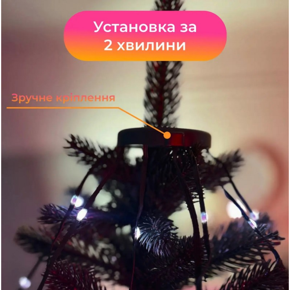 Умная гирлянда Smart 200 LED длиной 2 м с управлением через смартфон – идеальный выбор для современного декора помещений. Благодаря центральному кольцу и 10 нитям со светодиодами, ее легко установить на верхушку елки или использовать в оформлении интерьеров. Гирлянда управляется с помощью специального приложения для смартфона, позволяющего изменять цвета, режимы освещения и яркость. В комплекте входит пульт с предварительно установленными программами. Среди преимуществ — выбор более 16 миллионов цветов и более 500 режимов, которые можно синхронизировать с музыкой.