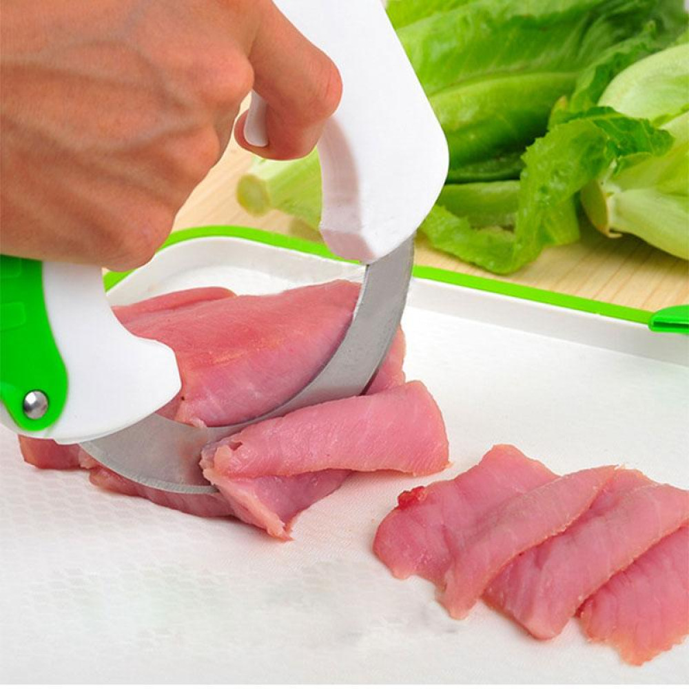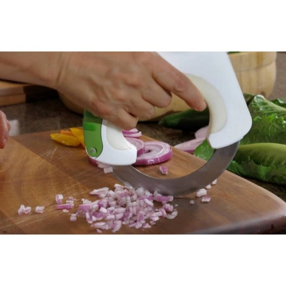 Благодаря непривычной для кухонных ножей форме (круглое лезвие с полукруглой ручкой) Bolo не только режет быстро, но и требует