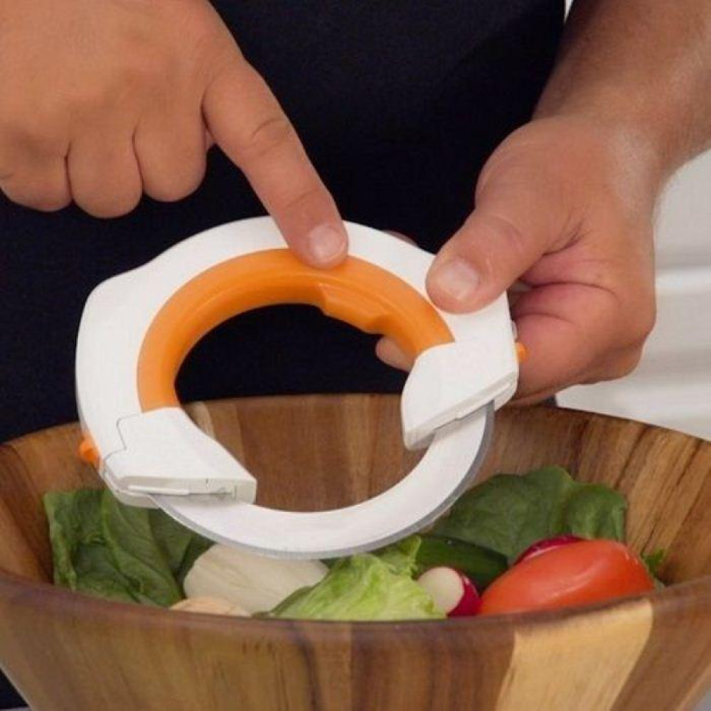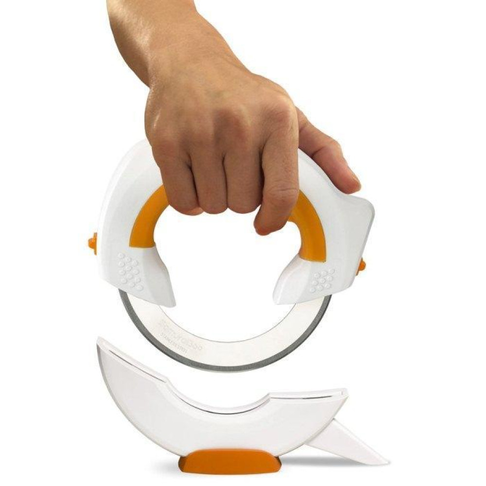 Универсальный кухонный круглый нож Самурай 360 для разрезания пиццы и быстрой шинковки овощей – изобретение канадского шеф-повара Рэндалла Корнфилда и группы его помощников, которые осмелились предложить новый дизайн кухонного ножа, и убедили в том, что использование разработанного ими круглого ножа является намного более эргономичным, нежели старая добрая классика.