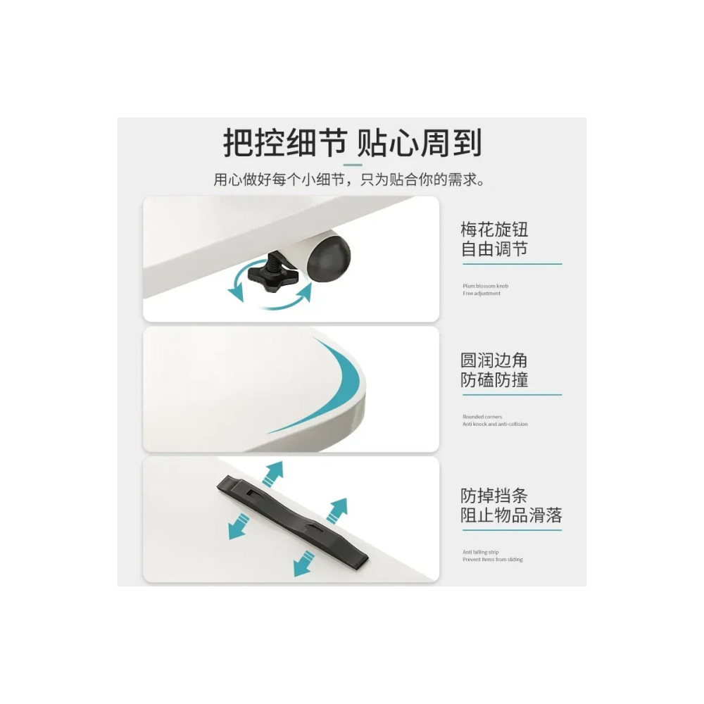 Универсальный прикроватный столик T01 — идеальное решение для тех, кто ценит мобильность, функциональность и удобство. Регулируемая высота от 60 до 95 см и наклонная рабочая поверхность делают его подходящим для работы за ноутбуком, чтения или завтрака в постели.