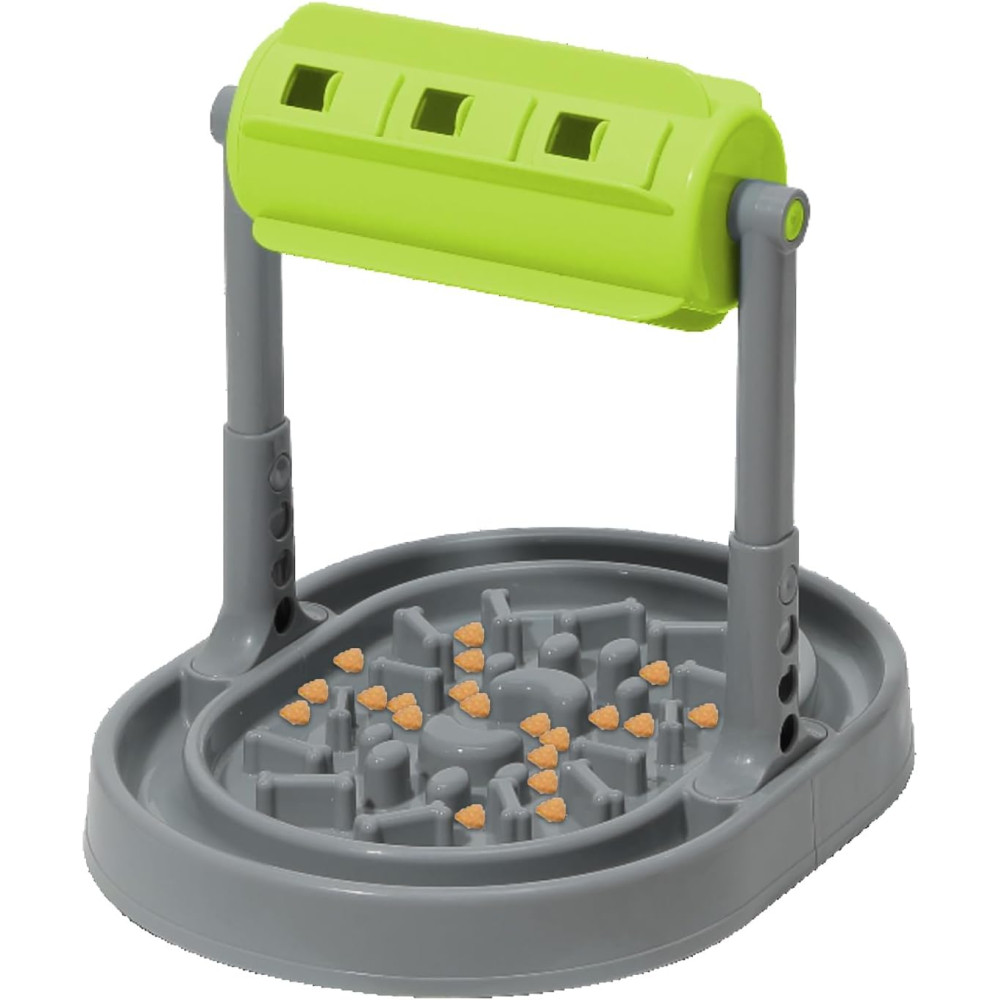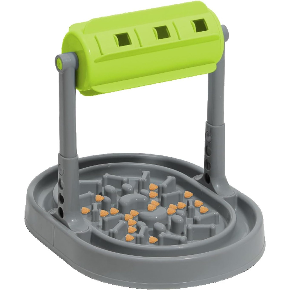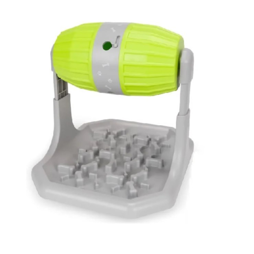 Питомец должен вращать барабан, чтобы лакомство или корм высыпались в нижний лоток-лабиринт. В процессе еды питомец развивает ловкость, интеллект и получает удовольствие от самостоятельного добывания еды