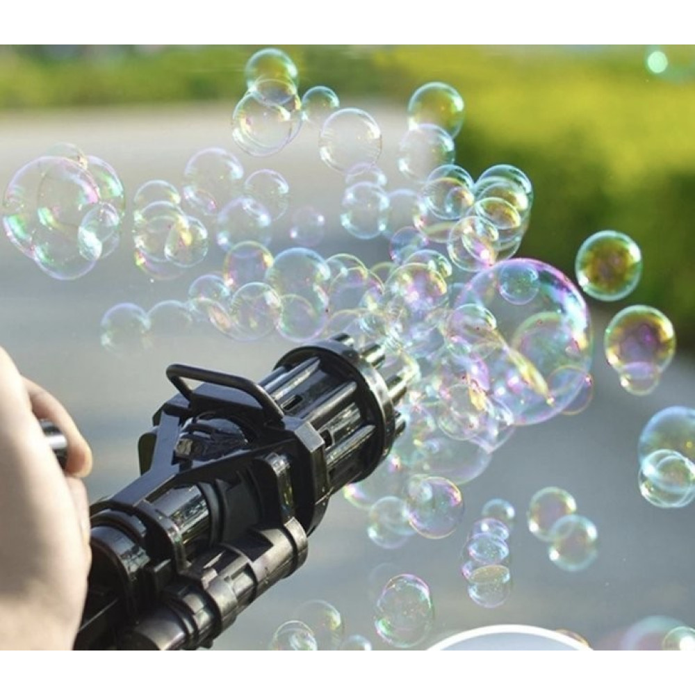 Подарит Вам и Вашим детям незабываемое праздничное настроение, т.к. больше не нужно каждый раз окунать специальную палочку во флакон с мыльной водой - достаточно один раз окунуть ствол игрушки в специальную чашу и готово - Пулеметная очередь из огромного количества пузыриков заполнит всё вокруг