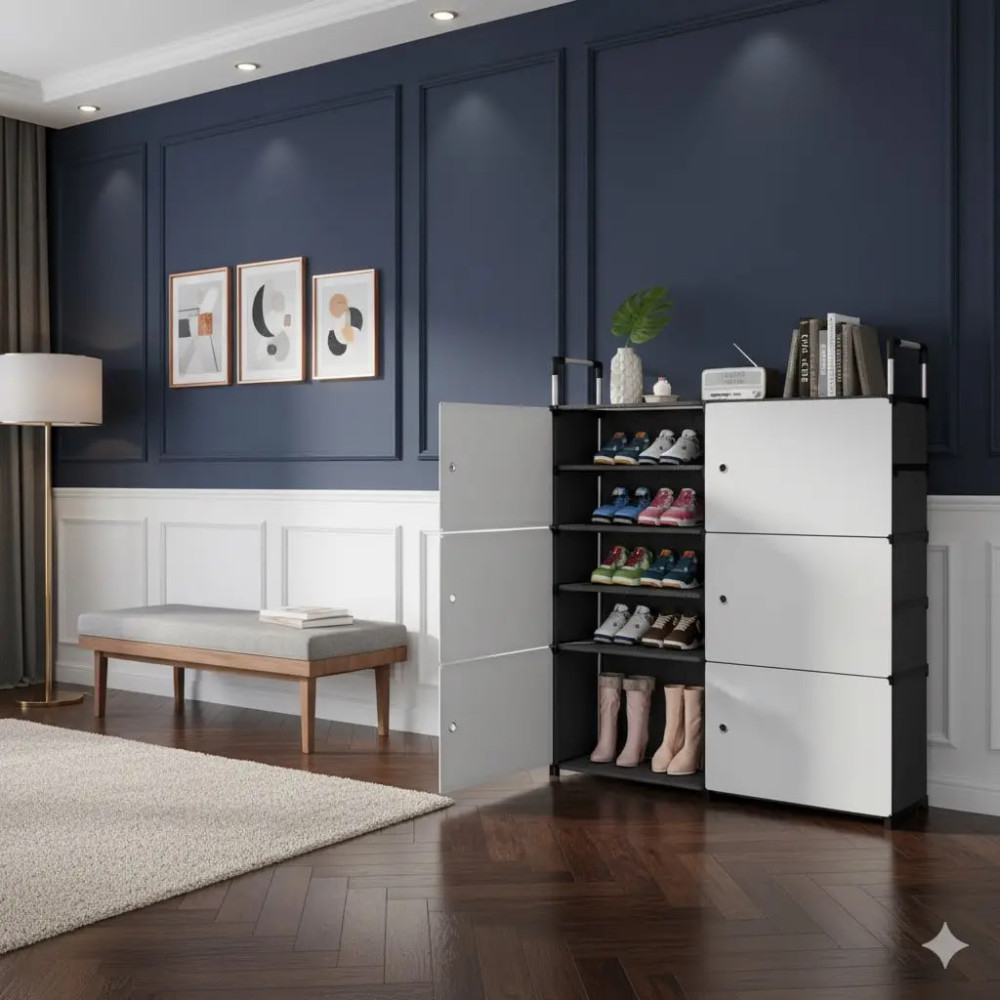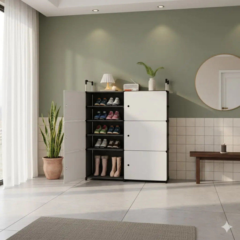 Благодаря 6 непрозрачным дверцам обувь скрыта от глаз и защищена от пыли, а контрастный дизайн корпуса и дверей добавляет интерьеру аккуратный и стильный вид.